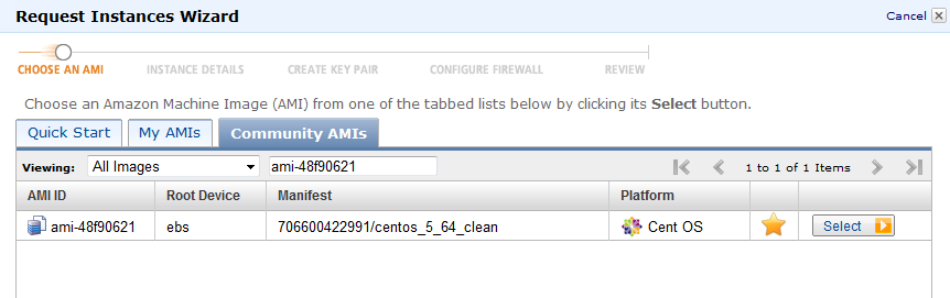 Launch a new EC2 instance from the AWS Management Console: I recommend using the community AMI ID ami-48f90621 which is CentOS 5, 64 bit. To select this AMI when launching, click “Community AMIs” and search for the ID. See the screen shot below.